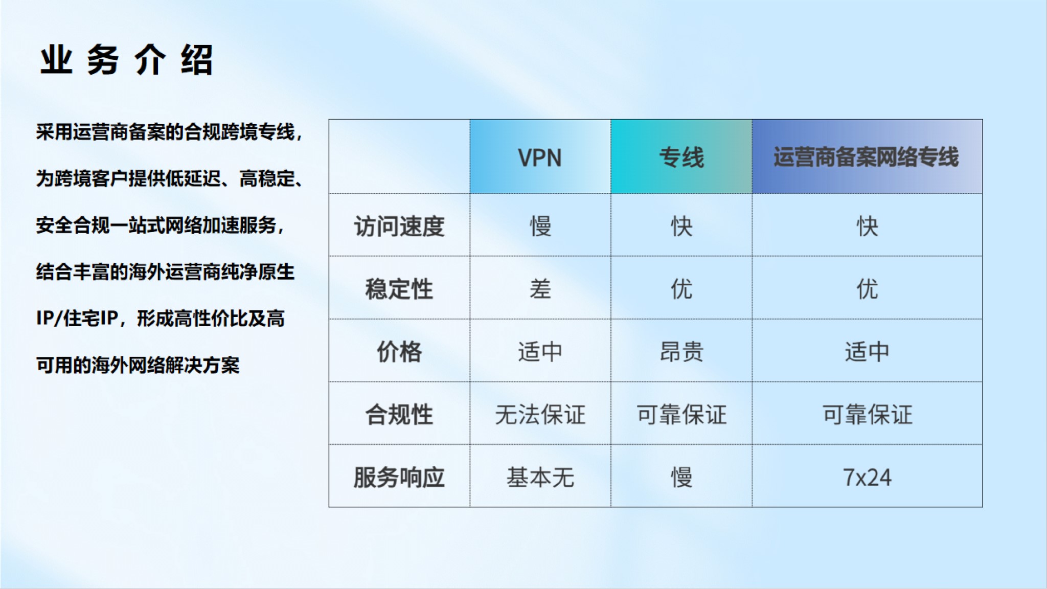 遵從運(yùn)營(yíng)商規(guī)則,采用運(yùn)營(yíng)商備案網(wǎng)絡(luò)專(zhuān)線(xiàn),結(jié)合海外運(yùn)營(yíng)商純凈獨(dú)享原生IP,提供低延遲、高穩(wěn)定、安全合規(guī)的海外網(wǎng)絡(luò)服務(wù)